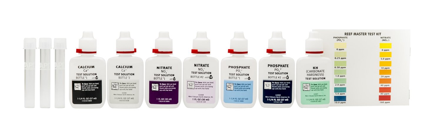 - API REEF MASTER TEST KIT Reef Aquarium Water Test Kit 1-Count, including 7 bottle of testing solution, 2 color cards and 4 glass test tubes with cap