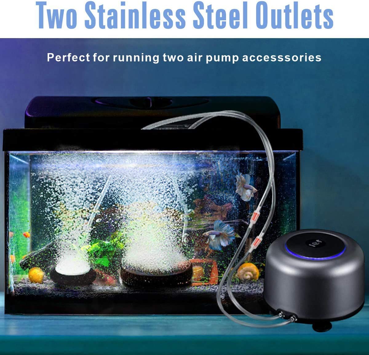 - 🔵【Two Stainless Steel Outlets,Large Volume Oxygen Pump】Super-powerful with superior stainless steel outlets,perfect for running two sponge filters or air stones etc accessories.super large amount of perfect dissolved oxygen,It oxygenates your aquarium, pond and hydroponic systems.5W Air Flow 200GPH for fish tank 1 to 300 gallon,10W Air Flow 285GPH for fish tank 1 to 600 gallon.