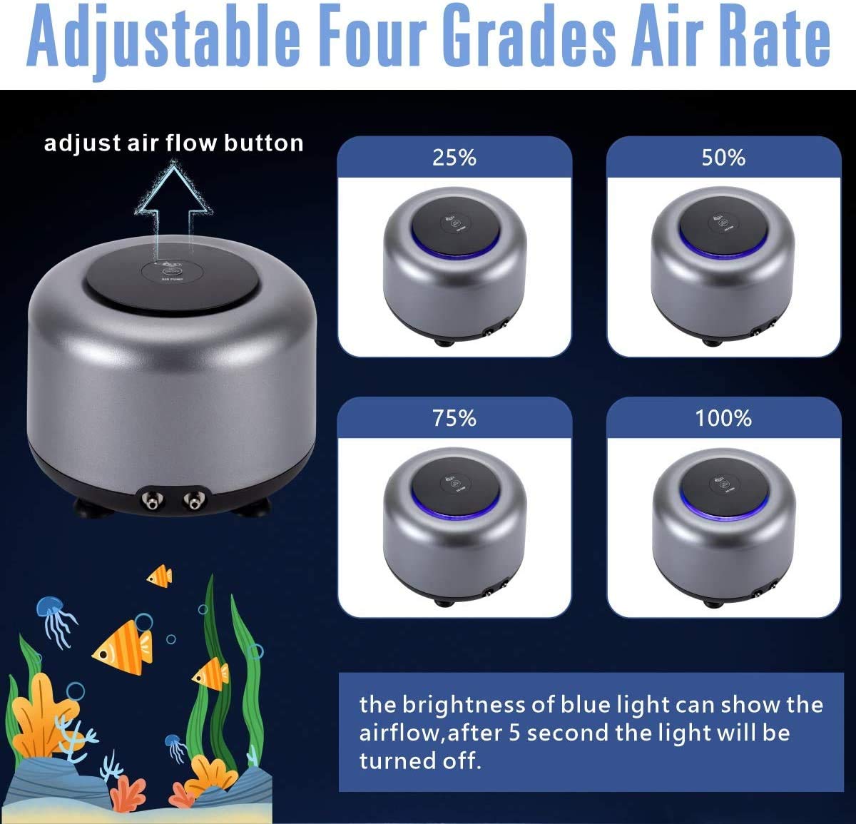 Welcome to AQQA🐟🐟 AQQA is a professional shop specializing in aquarium supplies and accessories,all products from this store the actual filming of goods please rest assured that you purchasers to buy! We are determined to provide better product and better services to our customers.Our customer service is online 24 hours, providing pre-sale, sale, after-sale service, the product implements a free return policy, Free replacement within 3 months. If you have any questions, please feel free to contact us. AQQA–Aquarium accessories,Quality Assurance Product Description 🐟Product Name:AQQA Air Pump for Aquariums 🐟Size:/510W 🐟Voltage:220240V/60Hz 🐟Cord length:6ft 🐟Air Flow:200GPH 285GPH 🐟Sound:<30 dB 🐟Package included:1×Air Pump 🐟Pressure:0.02MPa 0.04MPa 🐟Depth:5ft 6.5ft Why Choose Our Air Pump? 🔵Reason 1:The exterior of the air pump is beautiful. 🔵Reason 2:Ultra-quiet,If you feel that it does not have the effect we said, return it for free. 🔵Reason 3:four air flow grade can adjusted,allowing you to set the air output you want. 🔵Reason 4:Super-powerful,able to power two aquariums at once. Reason 5:The blue light can directly see the change in air flow Guides To adjust the amount of air, press the“set” button then the brightness of blue light will be changed,the amount of air will be adjusted.The brighter the larger of airflow,after 5 second the light will be turned off. Press the“set”button 3 seconds the air pump can be turned off.