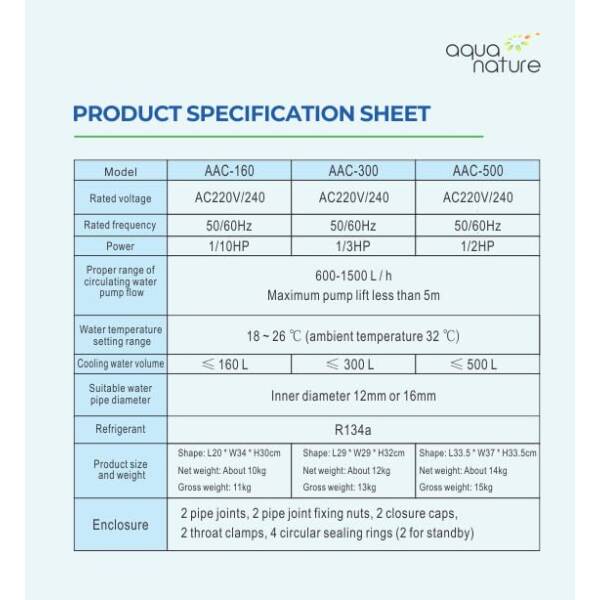 Dear Users: Thank you for choosing AQUANATURE ARCTIC CHILLER. The new generation of AQUANATURE’S ARCTIC CHILLERS suitable for freshwater & salt water Aquaria. The AQUANATURE ARCTIC CHILLERS newly design keeping everything in mind of hobbyist needs, include an increase in cooling efficiency and improved usability, functionality, and durability. AQUANATURE ARCTIC CHILLER is energy-efficient and environmentally friendly chiller. The new AQUANATURE ARCTIC CHILLER ONLY models 160,300,500 & 1000 Available with low energy consumption with Titanium coil chillers can easily outperform compressors by cutting energy consumption by 30% to 50%. EFFICIENT COOLING TECHNOLOGY High-end compressors and titanium coaxial heat exchangers provide high performance, low energy consumption, and low noise levels. DIGITAL THERMOSTAT Accurate temperature detection temperature control system.