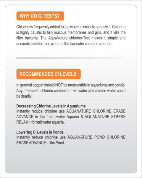 Chlorine is frequently added to tap water in order to sanitize it. Chlorine is highly caustic to fish mucous membranes and gills, and it kills the filter bacteria. The Aquanature chlorine-Test makes it simple and accurate to determine whether the tap water contains chlorine.