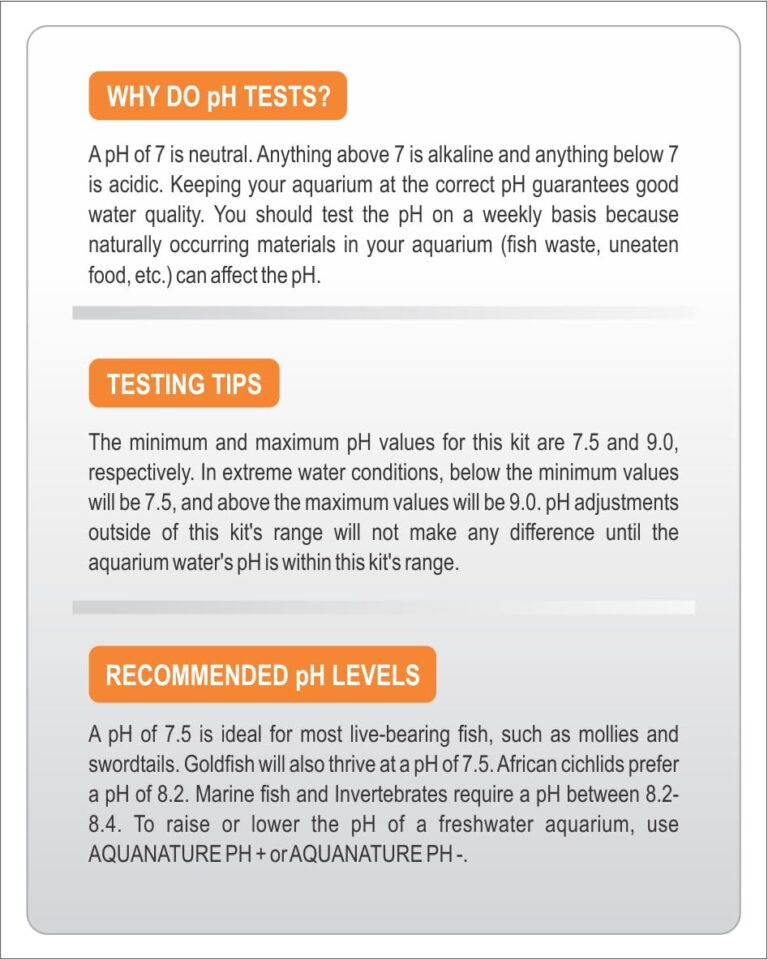 The minimum and maximum pH values for this kit are 7.5 and 9.0, respectively. In extreme water conditions, below the minimum values will be 7.5, and above the maximum values will be 9.0. pH adjustments outside of this kit’s range will not make any difference until the aquarium water’s pH is within this kit’s range.
