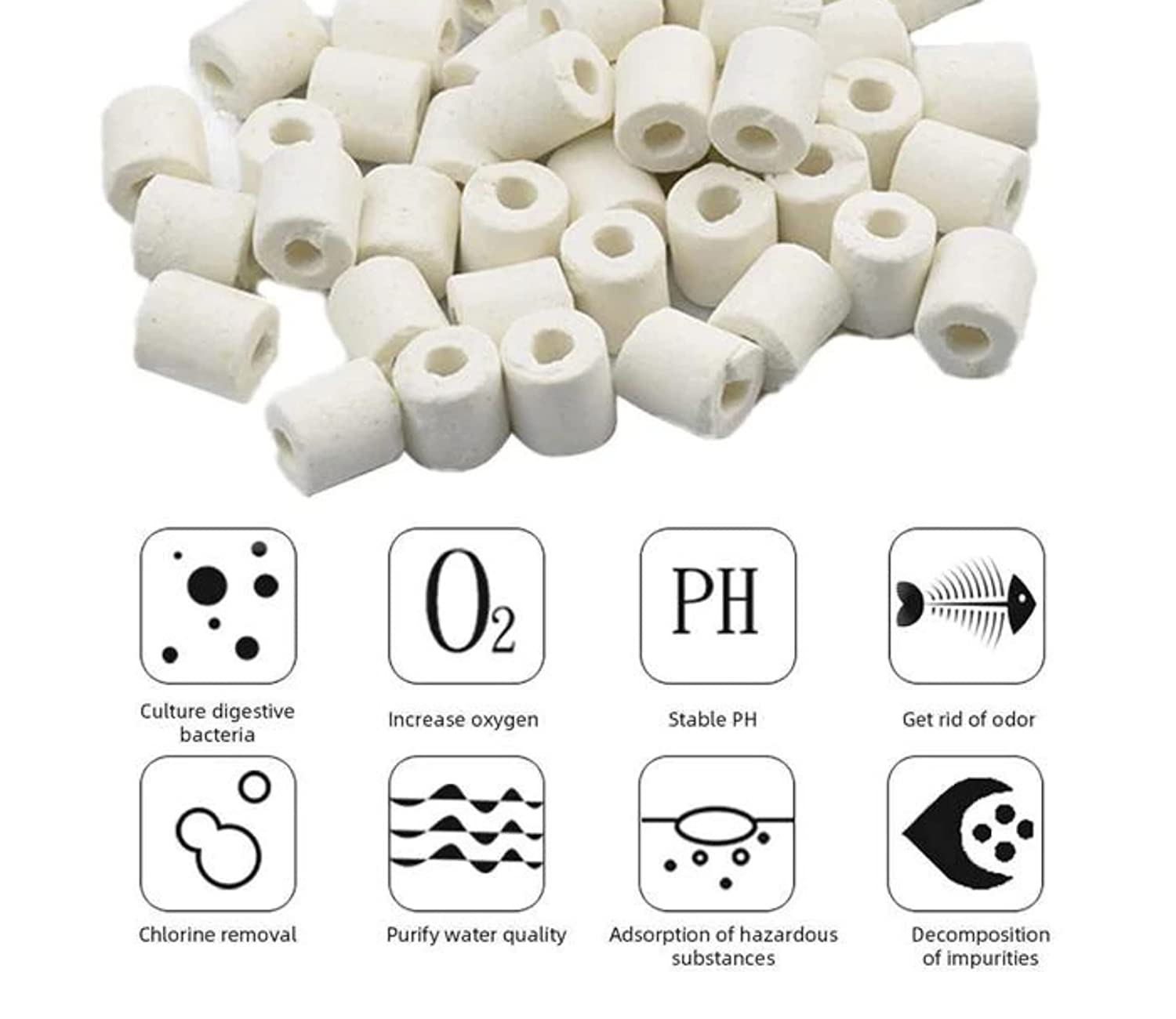 Aquarium ceramic rings have precise structures full of holes,adhere to which are a lot of good vital bacterium such as nitro-bacterium supplied to grow accompanying aquatic livings,also with good adsorption,improved the effect of biological filter and keep water stabilized.