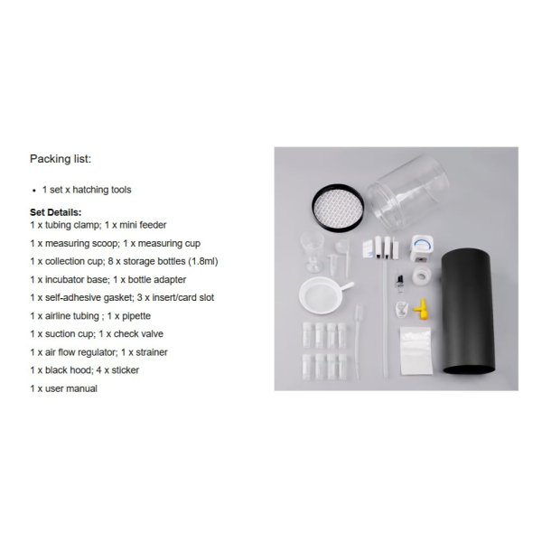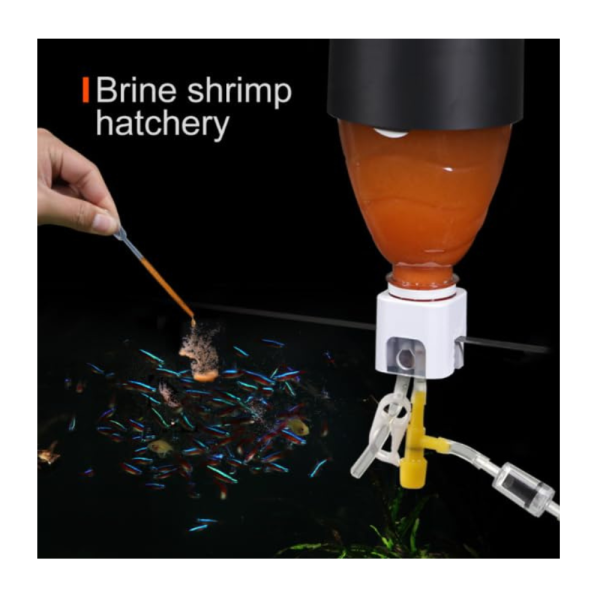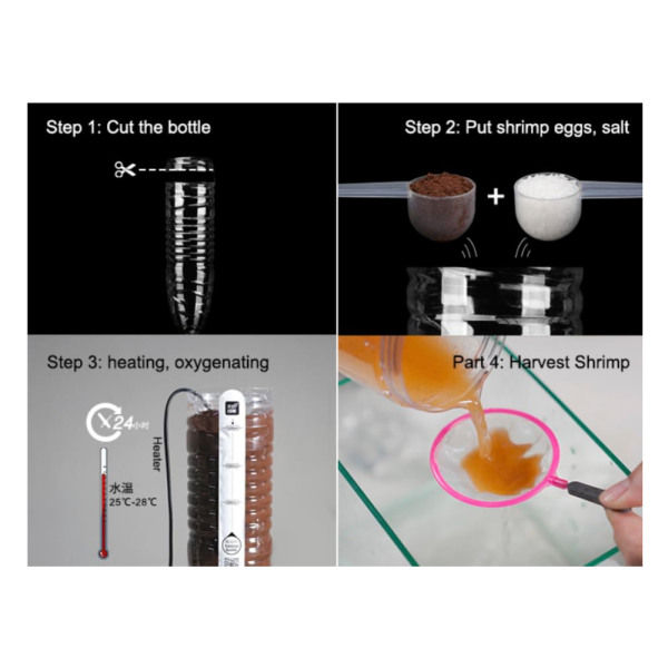 Easy to set up: 1. Prepare a bottle 2L, cut the bottle like below picture 2. Put brine shrimp eggs and salt according the manual proportion 3. Add the heater and keep water temperature around 28°C, air supply 24 hours. 4. Collect the brine shrimp after 24 hours