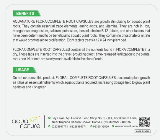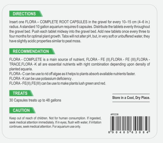 AQUANATURE FLORA COMPLETE CAPSULES are growth stimulating for aquatic plant roots They contain essential trace elements, amino acids, and vitamins. They are rich in iron, manganese, magnesium, calcium, potassium, inositol, choline B 12, biotin, and other factors that have been determined to be beneficial to aquatic plant roots. They contain no phosphate or nitrate that would promote algae proliferation. Eight tablets treats a 12 X 24 inch plant bed FLORA COMPLETE CAPSULES contain all the nutrients found in FIORA COMPLETE in a dry These tabs are inserted into the gravel, providing direct, time- released fertilization to the plants” root zone. Nutrients are slowly made available to the plants’ roots USAGE Do not overdose this product. FLORA-COMPLETE CAPSULES accelerate plant growth as it has all essential nutrients which aquatic plants required. Increasing dosage help to grow plant healthier and lush green.