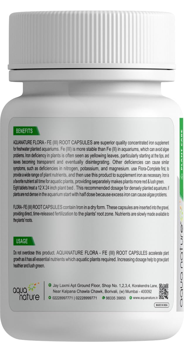 BENEFITS AQUANATURE FLORA – FE (III) ROOT CAPSULES is a superior quality concentrated iron supplement for freshwater planted aquariums. Fe (III) is more stable than Fe (II) in aquariums, which can avoid algae problems. Iron deficiency in plants is often seen as yellowing leaves, particularly starting at the tips, and leaves becoming transparent and eventually disintegrating. Other deficiencies can cause similar symptoms, such as deficiencies in nitrogen, potassium, and magnesium. use Flora-Complete first, to provide a wide range of plant nutrients, and then use this product to supplement iron as necessary. Iron is a favorite nutrient all time for aquatic plants, providing separately makes plants more red & lush green. Eight tablets treat a 12 X 24 inch plant bed . This recommended dosage for densely planted aquariums. if plants are not dense in the aquarium start with half dose because excess iron can cause algae problems. FLORA – FE (III) ROOT CAPSULES contain Iron in a dry form. These capsules are inserted into the gravel, providing direct, time-released fertilization to the plants’ root zone. Nutrients are slowly made available to the plants’ roots. USAGE Do not overdose this product. AQUANATURE FLORA – FE (III) ROOT CAPSULES accelerate plant growth as it has all essential nutrients which aquatic plants required. Increasing dosage help to grow plant healthier and lush green. DIRECTIONS Insert one FLORA – FE (III) ROOT CAPSULES in the gravel for every 10–15 cm (4–6 in.) radius. A standard 10 gallon aquarium requires 6 capsules. Distribute the tablets evenly throughout the gravel bed. Push each tablet midway into the gravel bed. Add new tablets once every three to four months for optimal plant growth. Tabs will not alter pH, but, in very soft or unbuffered water, they have slightly acidic properties similar to peat moss. RECOMMENDATION FLORA – COMPLETE is a main source of nutrient, FLORA – FE (II),FLORA – FE (III),FLORA – TRACE,FLORA – K all are essenti