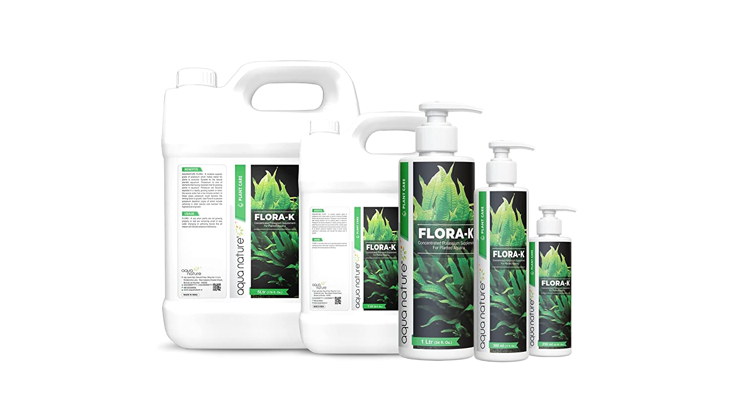 advantages. Flora-K contains superior grade of potassium which makes easier for plants to consume.suitable for the natural planted aquarium. Potassium is one of elements that having important role for growing plants in aquarium. Potassium can become depleted in a rapidly growing system or when the source water has a low mineral content. In these cases potassium could become the limiting factor to growth. Use Flora-K to prevent potassium depletion (signs of which include yellowing in older leaves) and maintain the highest level of growth. Use in aquarium keeping. use when plants are not growing properly or leaf are remaining small or less water changing or yellowing leaves this all reason will indicate potassium deficiency. Caution: Keep out of reach of children. Not for human consumption.if ingested drink water, seek medical attention immediately. If in eyes flush with water, if irritation continues, seek medical attention. shake well before use. Push 4 time Equal to (5 ml) per 32 US gallons (128 L) of aquarium. Repeat 2–3 times per week or as needed in response to signs of potassium deficiency in older leaves which include: chlorosis (yellowing), necrosis (death/browning), pinholes in leaves, and weak stems and roots. Treats 250 ml Treats up to 1600 gallons.