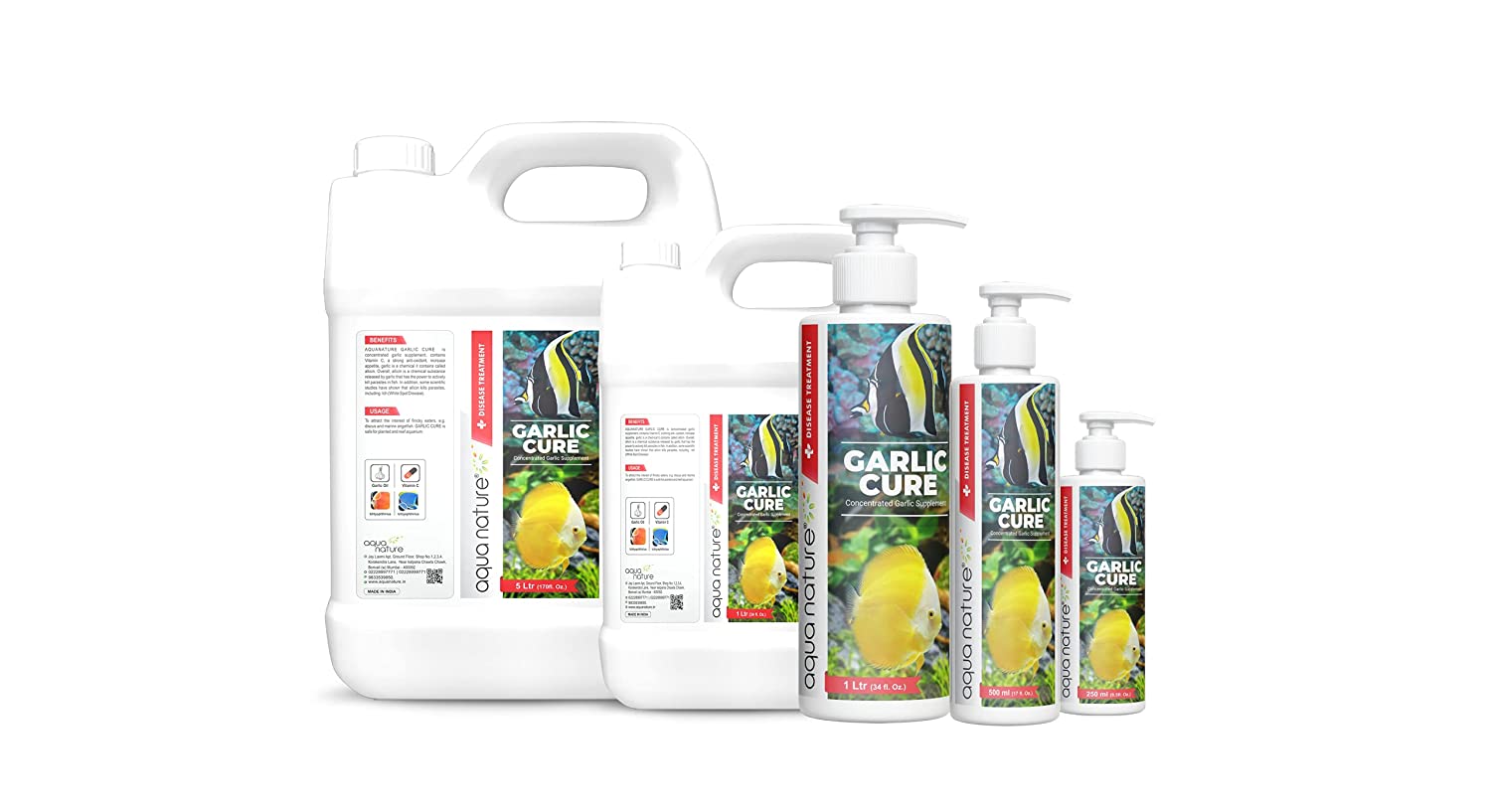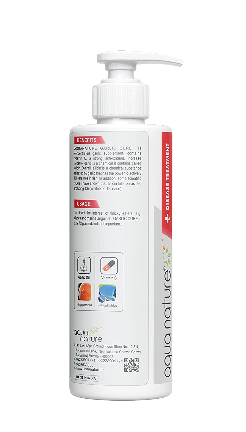BENEFITS AQUANATURE GARLIC – CURE is concentrated garlic supplement, contains Vitamin C, a strong anti-oxidant, increase appetite, garlic is a chemical it contains called allicin. Overall, allicin is a chemical substance released by garlic that has the power to actively kill parasites in fish. In addition, some scientific studies have shown that allicin kills parasites, including Ich (White Spot Disease). USAGE To attract the interest of finicky eaters, e.g. discus and marine angelfish. GARLIC – CURE is safe for planted and reef aquarium. DIRECTIONS shake well before use. Add few drops in wet or dry food. let the food sock GARLIC – CURE for few minutes then feed the fishes, To attract the interest of finicky eaters. its is advisable to feed GARLIC with food when fishes are having ich problem. RECOMMENDATION AQUANATURE GARLIC – CURE can be use to attract the interest of finicky eaters fishes. STORAGE Store in a cool,dry place. CAUTION Keep out of reach of children. Not for human consumption. If ingested drink water, seek medical attention immediately. If in eyes, flush with water, if irritation continues, seek medical attention.