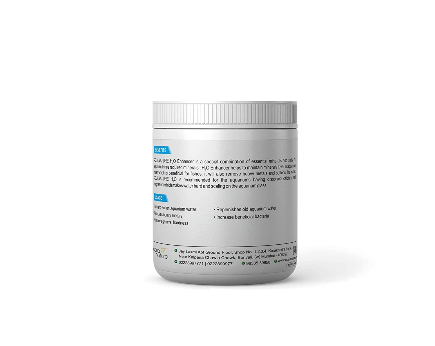 BENEFITS AQUANATURE H₂O Enhancer is a special combination of essential minerals and salts. All aquarium fishes required minerals , H₂O Enhancer helps to maintain minerals level in aquarium water which is beneficial for fishes. it will also remove heavy metals and softens the water. AQUANATURE H₂O is recommended for the aquariums having dissolved calcium and magnesium which makes water hard and scaling on the aquarium glass. USAGE . Helps to soften aquarium water . Removes heavy metals . Reduces general hardness . Replenishes old aquarium water . Increase beneficial bacteria DIRECTION Add 1 Scoop of AQUANATURE H₂O For 50 US Gallon (100 L) Measuring scoop inside the jar. RECOMMENDATION Use AQUANATURE CHLORINE ERASE ADVANCE while adding tap water, fast increase of oxygen supply use AQUANATURE OXY BOOSTER. CAUTION Keep out of reach of children. Not for human consumption. seek medical attention immediately. If in eyes, flush with water, if irritation continues, seek medical attention. TREATS 200 gm treats up to 5000 gallons