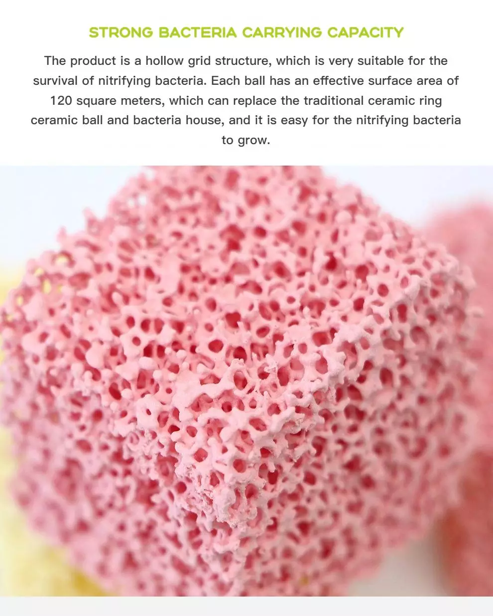 The inside structure filter media are all connected , the surface are of every gram filter material can be 4m2. Effective using rate 98%• Ultra high surface area and open porosity • Eliminates ammonia and nitrites and minimizes nitrates • Specifically designed for the high flow of koi and goldfish ponds and aquaculture systems. • Use in sumps, extra-large filters , shower filters and waterfall filters etc • Lowers pond maintenance and improves water quality •Allows for higher fish loads High adsorbabiliity , which can obviously accelerate the adhesion of nitrifying bacteria and mass propagation , increase build nitrification system .