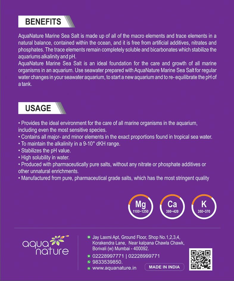 AquaNature Marine Sea Salt is made up of all of the macro elements and trace elements in a natural balance, contained within the ocean, and it is free from artificial additives, nitrates and phosphates. The trace elements remain completely soluble and bicarbonates which stabilize the aquariums alkalinity and pH. AquaNature Marine Sea Salt is an ideal foundation for the care and growth of all marine organisms in an aquarium. Use seawater prepared with AquaNature Marine Sea Salt for regular water changes in your seawater aquarium, to start a new aquarium and to re- equilibrate the pH of a tank.