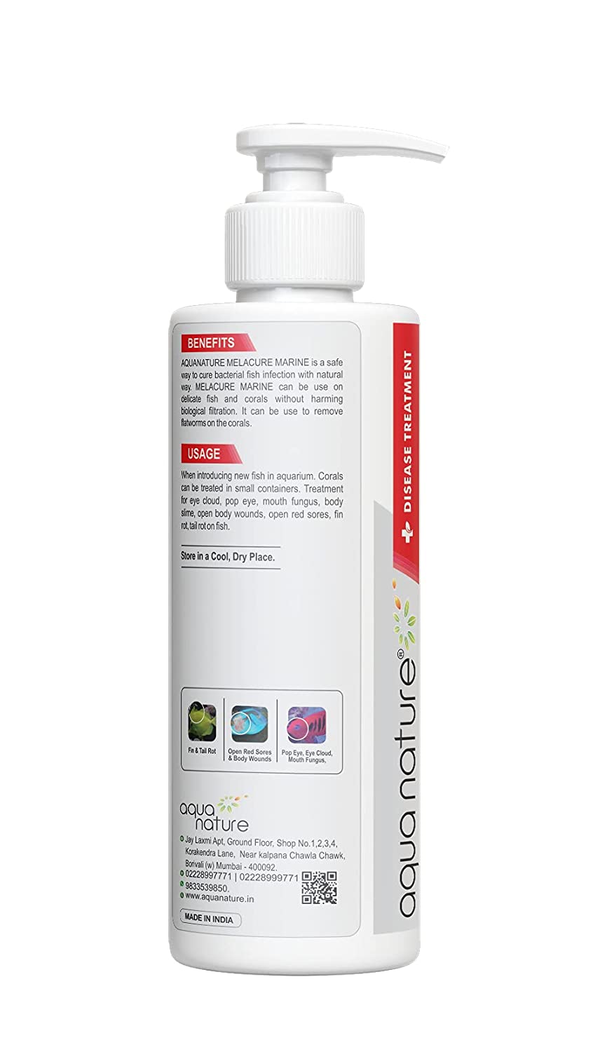 A safest way to cure bacterial fish infection with natural way.MELACURE MARINE can be use on marine fish and corals in aquarium without harming biological filteration.Can be use to remove flatworms on corals.