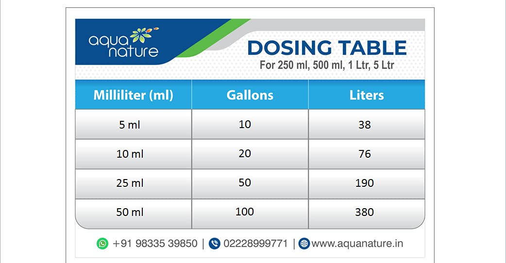 Push 4 time Equal to (5 ml) per 10 US gallons (38 L) of aquarium.