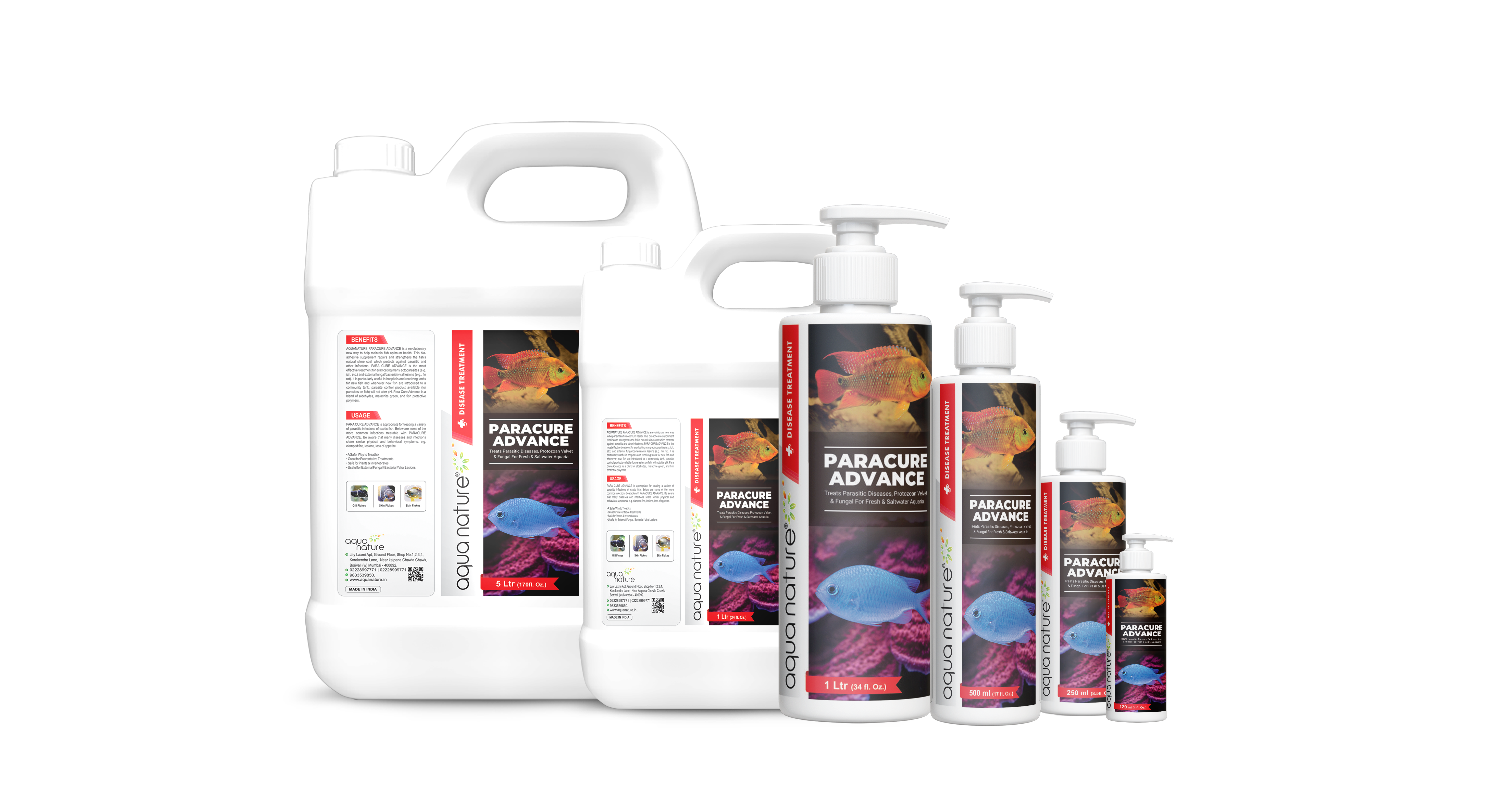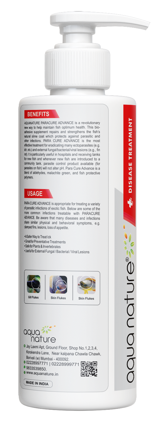 Shake well before use.Dosing in Water Remove all invertebrates from the tank as well as any chemical filtration. Push 4 times equal to (5 ml) of ParaCure Advance for every 40 L (10 US gallons). Repeat this dose daily as required as long as fish show no stress. ParaCure Advance can also be used as a medicated dip. For 1 hour dips, use 3 mL per 4 L (1 US gallon) in a container separate from your main tank. Dips may be extended if the fish show no evidence of stress.Quarantine You can medicate new fish before they go into the main tank. ParaCure Advance Quarantine times vary, but we generally recommend 2 weeks of treatment with ParaCure Advance to clear out any possible external infections. Sensitive Fish Few scale less fishes are sensitive to medications. If you observe that your fish are not comfortable then cut back doses into half. After Treatment over, use AQUANATURE PREMIUM ACTIVATED CARBON.