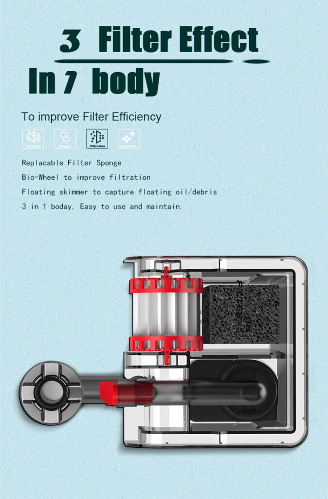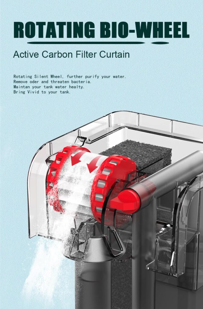- Filter Wheel Design, Efficient Filter Effect.Spiral floating skimmer, remove floating debris this easy.Copper motor silent operation.Add enough water when first time using, and no need to add water again when motor restarted.Versatile Filters for planted and marine aquarium.Filter box design, big separate space for your filter media. Flow adjustable, adjust the best flow for the best filter effect.