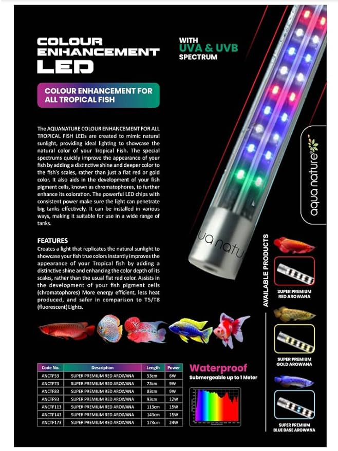 - The AQUANATURE COLOUR ENHANCEMENT FOR ALL TROPICAL FISH LEDs are created to mimic natural sunlight, providing ideal lighting to showcase the natural color of your Tropical Fish.