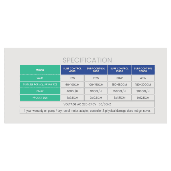 Size (Upto) | Surf Control 15000(15000L/H-30W), Surf Control 20000(20000L/H-40W), Surf Control 4000(4000L/H-10W), Surf Control 9000(9000L/H-20W) |