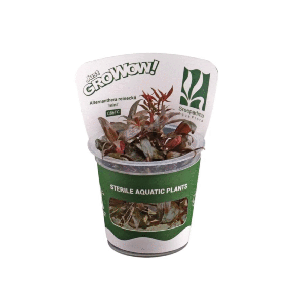 Alternanthera reineckii ‘Mini’ is a compact, slow-growing stem plant favored for its rich red to violet hues and suitability in aquascaping. Its slow growth rate makes it easier to maintain over time, although it requires consistent care to achieve optimal color and form. Due to its low stature and dense, bushy appearance when trimmed regularly, it is best positioned in the foreground or midground of aquariums, depending on tank size. High lighting and CO₂ injection are essential to enhance its coloration and keep the growth compact. Without sufficient light or CO₂, the plant may grow leggy and lose vibrancy. Nutrient-rich substrate and regular fertilization, especially with iron, help maintain healthy growth. The plant can be grown either emersed or submersed, with submersed forms producing more intense coloration. Reaching up to 8 inches (20 cm) in height, it responds well to trimming, which also promotes horizontal spread. Propagation is simple via stem cuttings, which can be replanted to expand the colony. When properly maintained, reineckii ‘Mini’ becomes a striking focal point in nature-style and Dutch aquascapes alike.