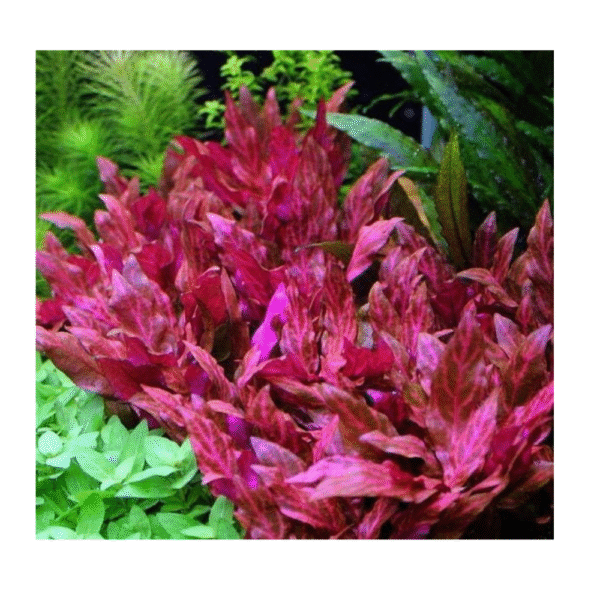 Alternanthera reineckii “Rosanervig” is a captivating and vibrant aquatic plant known for its distinctive pink and red hues. Belonging to the amaranth family (Amaranthaceae), this cultivar is a variation of the popular Alternanthera reineckii. Originating from South America, “Rosanervig” stands out with its striking coloration, making it a sought-after choice for aquascaping enthusiasts. The plant’s leaves are lance-shaped and exhibit a unique blend of green and intense pink or red pigmentation. The undersides of the leaves often feature a contrasting pinkish color, creating a visually appealing effect. Under optimal conditions, the plant can develop a lush and bushy appearance, making it an excellent choice for adding depth and contrast to aquarium layouts.