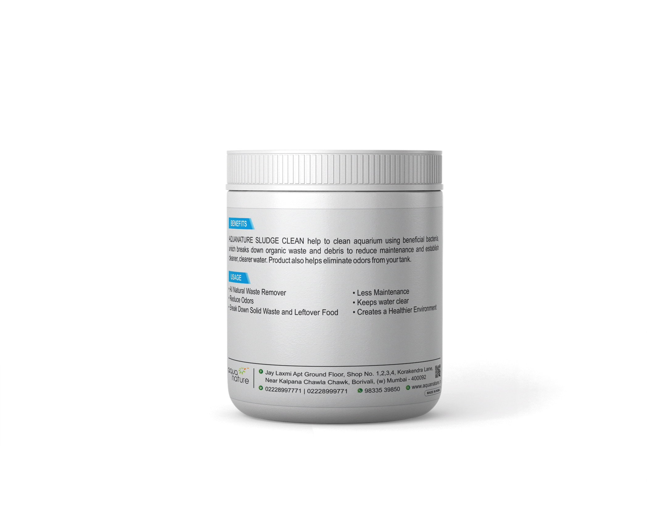 BENEFITS AQUANATURE SLUDGE CLEAN help to clean aquarium using beneficial bacteria, which breaks down organic waste and debris to reduce maintenance and establish cleaner, clearer water. Product also helps eliminate odors from your tank. USAGE All Natural Waste Remover Reduce Odors Break Down Solid Waste and Leftover Food Less Maintenance Keeps water clear Creates a Healthier Environment DIRECTIONS Add 1 Scoop of AQUANATURE TURTLE SLUDGE CLEAN (2 gm) For 35 us gallons (133 L). NOTE: Measuring scoop inside Do not overdose to avoid Cloudiness in aquarium water. RECOMMENDATION Use AQUANATURE TURTLE WATER CONDITIONER while changing water. STORAGE Store in a cool,dry place. CAUTION Keep out of reach of children. Not for human consumption.