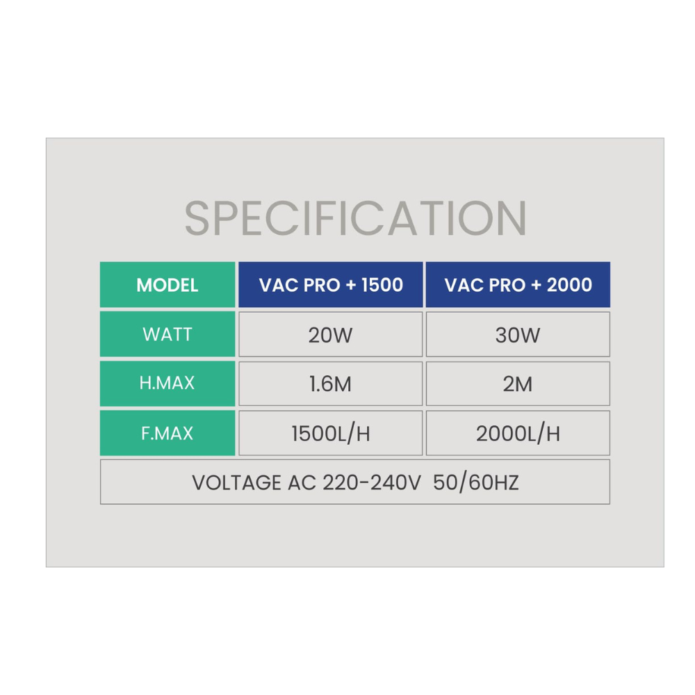 | Size (Upto) | Vac Pro+ 1500(1500L/H – 20W), Vac Pro+ 2000(2000L/H – 30W) |