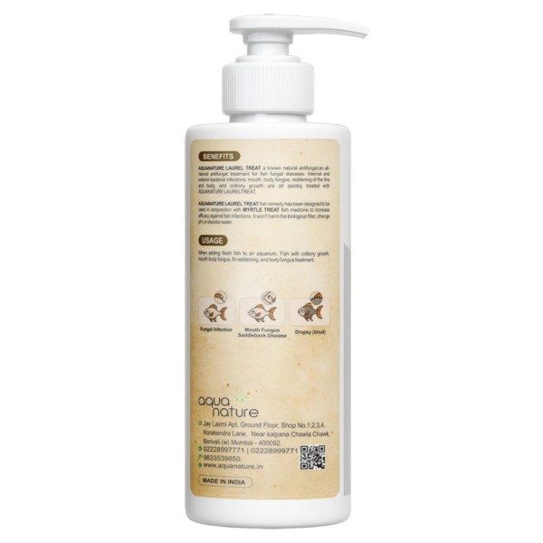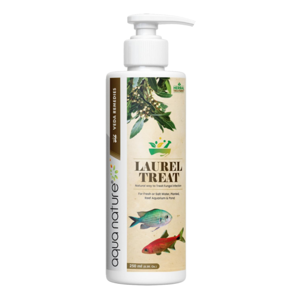 AQUANATURE LAUREL TREAT a known natural antifungal.an all-natural antifungal treatment for fish fungal diseases. Internal and exterior bacterial infections, mouth, body fungus, reddening of the fins and body, and cottony growth are all quickly treated with AQUANATURE LAUREL TREAT. AQUANATURE LAUREL TREAT fish remedy has been designed to be used in conjunction with MYRTLE TREAT fish medicine to increase efficacy against fish infections. It won’t harm the biological filter, change pH, or discolor water. USAGE when adding fresh fish to an aquarium. Fish with cottony growth, mouth-body fungus, fin reddening, and body fungus treatment. DIRECTIONS Shake well before use. Push 4 times Equal to (5 ml) per 10 US gallons (38 L) of aquarium. Remove activated carbon. Stop uv sterilizer. Treatment continues for a week 5 ml for 38 L daily. changing water of 25 % after a week continues medication if necessary. . Biological filters may remain in operation. . We recommend to filter the water with AQUANATURE PREMIUM ACTIVATED CARBON after the treatment is finished. RECOMMENDATION A lot of medications are either based on copper or contain additional potent substances. Few medications alter the color of the water in aquariums, but LAUREL is an extract made naturally from the leaves. avoid discoloring the water; safe for fragile and scale less fish. appropriate for an aquarium with plants. it strengthens the fishes’ immune systems; AQUANATURE VITAMIN C or AQUANATURE VITAMIN + can be used with or after medication. STORAGE Store in a cool,dry place. CAUTION Keep out of reach of children. Not for human consumption. If ingested drink water, seek medical attention immediately. If in eyes, flush with water, if irritation continues, seek medical attention.