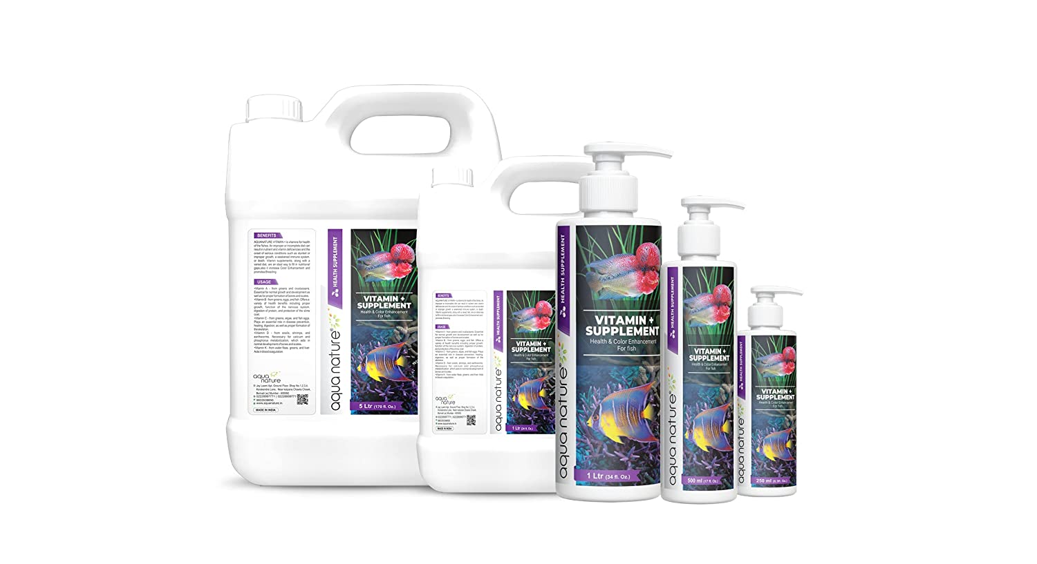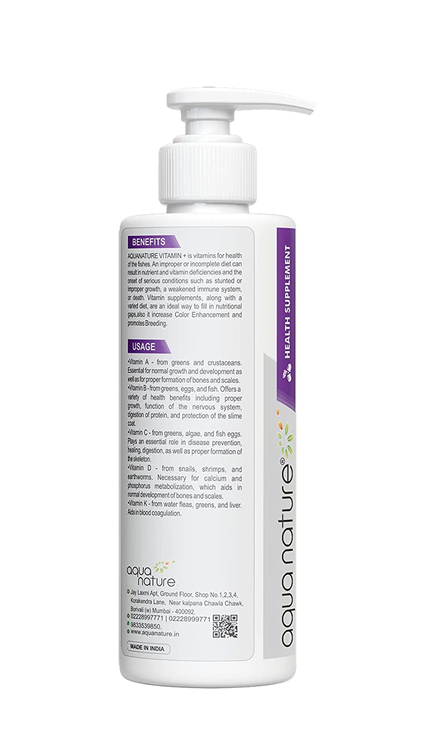 BENEFITS AQUANATURE VITAMIN + is vitamins for health of the fishes. An improper or incomplete diet can result in nutrient and vitamin deficiencies and the onset of serious conditions such as stunted or improper growth, a weakened immune system, or death. Vitamin supplements, along with a varied diet, are an ideal way to fill in nutritional gaps,also it increase Color Enhancement and promotes Breeding. USAGE Vitamin A – from greens and crustaceans. Essential for normal growth and development as well as for proper formation of bones and scales. Vitamin B – from greens, eggs, and fish. Offers a variety of health benefits including proper growth, function of the nervous system, digestion of protein, and protection of the slime coat. Vitamin C – from greens, algae, and fish eggs. Plays an essential role in disease prevention, healing, digestion, as well as proper formation of the skeleton. Vitamin D – from snails, shrimps, and earthworms. Necessary for calcium and phosphorus metabolization, which aids in normal development of bones and scales. Vitamin K – from water fleas, greens, and liver. Aids in blood coagulation. . DIRECTIONS shake well before use. Add few drops in wet or dry food. let the food sock VITAMIN + for few minutes then feed the fishes.It is advisable to feed with food daily or when fishes are having problem .directly can be add 1 drop per gallon directly into the aquarium water. STORAGE Store in a cool,dry place. CAUTION Keep out of reach of children. Not for human consumption. If ingested drink water, seek medical attention immediately. If in eyes, flush with water, if irritation continues, seek medical attention.