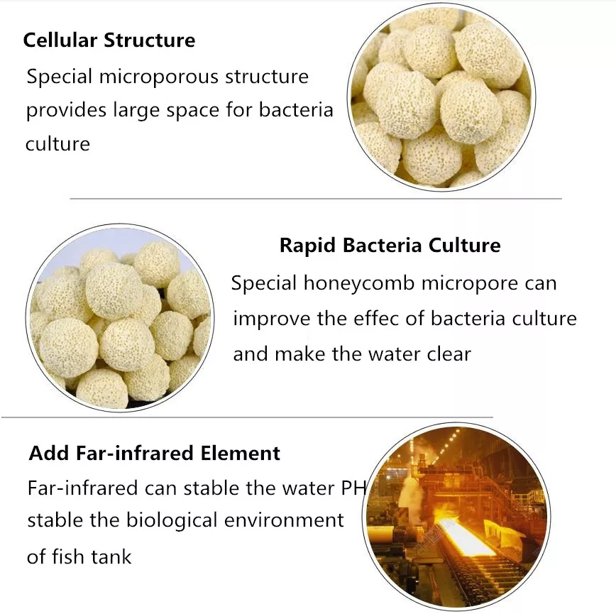 Far-infrared bacteria house main raw material is tourmaline, it will be electrified by electrostatic effect, because of its unique chemical properties, it can radiate far infrared, stimulate the negative oxygen ions, to promote the metabolism of fish, kill harmful bacteria, improve the oxygen capacity.This filter also contains kaolinite, can supplement rich minerals and trace elements.Under certain conditions, these substances will decompose slowly and be absorbed by fish.Far infrared bacteria house with porous structure, to promote the proliferate of beneficial bacterium, its huge specific surface area make it have stronger ability of ecological filter processing. Material: Kaolinite and Tourmaline Production:1300℃ high-temperature calcination Construction Features It contains micro-elements like kalium,calcium,magnesium and etc. 60-300um interior diameter is designed for a better growth and reproduction of microbes. It has wider specific surface(5~10 times wider than other filters ) and highly permeable pore structure. Glass Ceramic Ring,a wide-used filter product,works as a “cleaner” in the water ecosystem.It has outstanding characteristics in relation to the water quality and water flow. Usage: 1. Please clean the filter by water before filling materials in the filter groove. Different filter materials can be placed as single layer or mixed together. 2. 1L bio-chemical filtering materials can be used for 60L(60kg) water. Filtering effect is related to the using time, density of fishes and aquatic plants, water quality and size of stream.