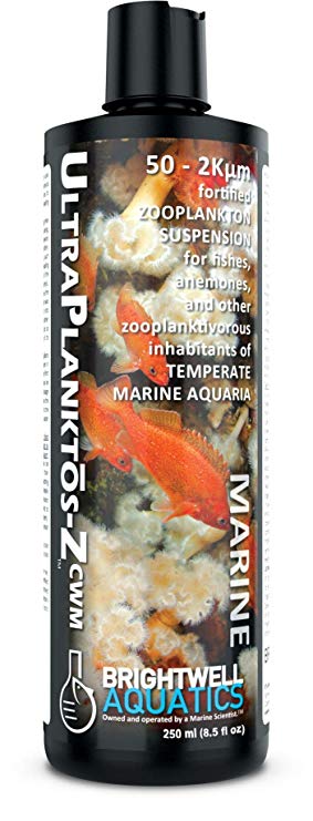 “UltraPlanktos Z-CWM” is a 50 – 2Kµm fortified Zooplankton Suspension for Fishes, Anemones, and other Zooplanktivorous Inhabitants of Temperate (cold water) Marine Aquaria.Shake product well before each use. Turn protein skimmer and other forms of mechanical filtration off prior to adding food suspensions to aquaria, and allow 10 – 15 minutes after feeding before resuming operation of filtration. Target Feeding (recommended): Target feeding may be carried out with a lengthy piece of rigid air tubing, plastic syringe, pipette, dropper, or similar device; pour 5 ml (1 capful on 250- and 500-ml bottles; 1/2-capful on 2L bottle) into a clean container, such as a cup, and suck a portion of this into the feeding device, then slowly discharge the contents of the device 2 – 4” upstream of the target organism(s). Repeat these steps as deemed necessary. Rinse the portion (inside and outside) of the feeder that was placed into aquarium water before placing it into this bottle (if feeding directly from the bottle rather than from a separate container); failure to do so will contaminate the product and encourage it to decompose. Broadcast Feeding: Add up to 5 ml per 50 US-gallons (189 L) of water in the entire aquarium system in an area of rapid water movement daily for the first four weeks of use; thereafter, the dosage may be increased as desired. Beginning with a low dosage and gradually increasing it with time will allow the biological filtration in the aquarium to adjust to the increase in nutrients, and helps discourage water quality from deteriorating. When feeding sessile invertebrates, planktonic food suspensions (such as this one) are best utilized by target feeding specific invertebrates in an aquarium; in doing so, the majority of the food may be consumed by the intended organisms rather than ending up in filtration media or indirectly impacting water quality