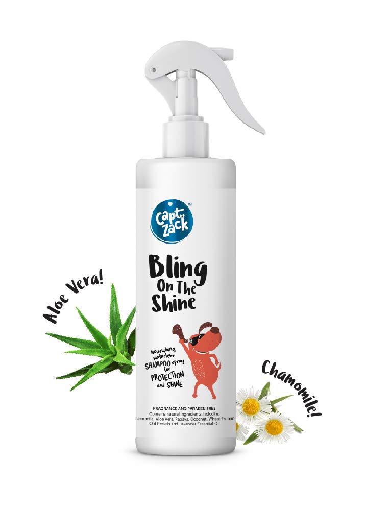 - Waterless Shampoo for Shine and Protection: Captain Zack Bling on the Shine offers a stress and mess-free way to keep your dog clean and smelling fresh, in between baths.