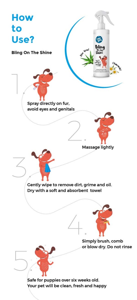- Usage: Spray gently on the fur and massage lightly. Gently wipe to remove dirt, grime, and oil. Repeat if necessary. Dry with a soft and absorbent towel and then simply brush, comb or blow dry. Safe for puppies over six weeks old.
