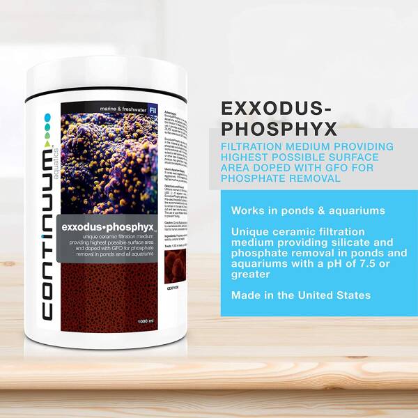 Exxodus•Phosphyx is unique in that it is doped with GFO (ferric oxyhydroxide) which is bound in the material as well as coated onto all the vast surface area and acts to remove unwanted phosphate and silicate from aquarium water more efficiently than any other known material. It works extremely well in nano aquariums, as well as systems of all sizes. It is particularly well suited to reef systems with live rock including FOWLR systems. Use in a canister filter, reactor, or other type of aquarium filter with slow to moderate water flow. Do not fluidize because the product may grind down or release particles into the aquarium due to mechanical action. It should be subjected to a low and non-turbulent flow rate, if possible.