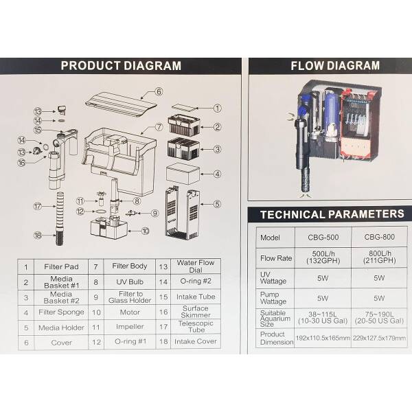 | Model | Voltage | Frequency | Pump Power | UV Power | Flow Rate | Suitable Aquarium Size | Dimensions L×W×H |