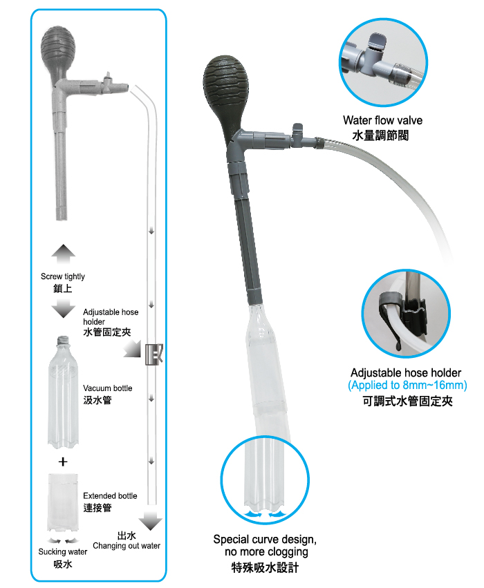 Adjust water flow at anytime when changing water Curve design of water vacuum bottle, no clogging of water flow Hose holder included, stabilize the hose well on the bucket.
