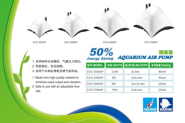 | Size (Upto) | ECO-2500AP Single Outlet (2.5w – 3L/Min), ECO-3500AP Double Outlet (5w – 2x3L/Min) |