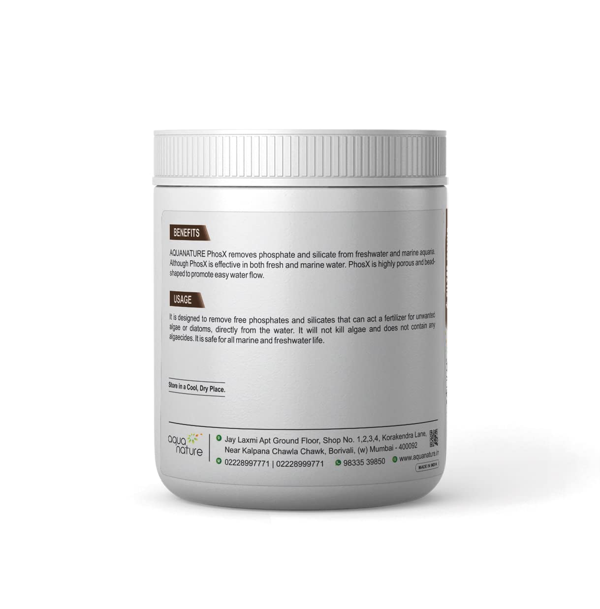 BENEFITS AQUANATURE PhosX removes phosphate and silicate from freshwater and marine aquaria. Although PhosX is effective in both fresh and marine water. PhosX is highly porous and bead-shaped to promote easy water flow. USAGE It is designed to remove free phosphates and silicates that can act as fertilizer for unwanted algae or diatoms, directly from the water. It will not kill algae and does not contain any algaecides.