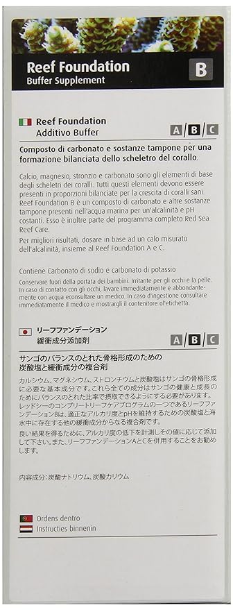 - Red Sea’s Reef Foundation B is a complex of carbonate and other buffers present in seawater that maintain proper alkalinity and pH, and is part of Red Sea’s complete Reef Care program. Calcium, magnesium, strontium and carbonate are the basic foundation elements of coral skeletons.