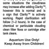 Clarity™ is the ultimate clarifier for both fresh and saltwater. It employs an advanced polymeric flocculating agent that is both reef and plant safe. Clarity™ is the only clarifier on the market that does it all! Clarity™ will clear all types of clouding. Many companies manufacture multiple products to clear up each type of cloudiness and each different environment (e.g. freshwater, marine, reef, etc.). Some companies have developed products that will clear most types of cloudiness, but their application requires two separate bottles of product. Clarity contains compounds that will clear all types of cloudiness in all environments. Clarity contains both precipitating and flocculating agents in the same bottle, enabling all types of cloudiness to be removed in one dose. Upon adding Clarity™ to the water, you will see a cloudy haze begin to form. This is normal and means that Clarity™ is beginning to work. The water is filled with tiny pieces of floating matter that were not visible to the naked eye. Clarity™ makes those pieces of matter begin to clump together. As they clump together they form larger pieces of matter that are now visible, hence the cloudiness. Once this matter has clumped together, it is a simple matter of mechanical filtration to remove the residue. Matter that was once too small to get caught in filter media is now in large enough clumps. In order for Clarity™ to work effectively, you should have a filter with mechanical filtration (e.g., filter floss) connected to your aquarium.