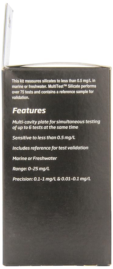 MultiTest™ Silicate measures silicates to less than 0.5 mg/L in marine or freshwater. This kit measures soluble silicate and reports it as silicate concentration. To convert to silicon, multiply by 0.3. It performs over 75 tests and contains a reference sample for validation.