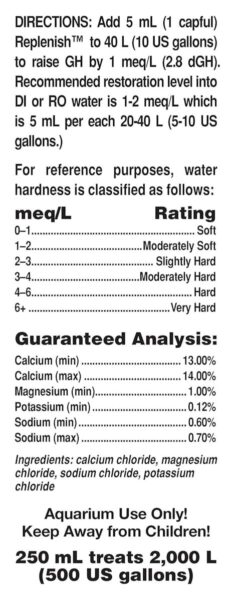Convenient liquid water conditioner simplifies mineralization of pure reverse osmosis water. Reverse osmosis or de-ionizing filtration effectively removes dissolved solids, including minerals necessary for aquarium fish health (osmoregulation). This proprietary blend of salts replenishes these important minerals lost during the production of purified ro/di water. Seachem replenish restores general hardness (gh) using a balanced blend of both “soft” (sodium, potassium) and “hard” (calcium, magnesium) salts. Restoration of mineral content is essential since a complete lack of minerals will result in osmotic stress. 250 Ml treats 500 gallons. Directions: add 5 ml (1 capful) replenish to 40 l (10 us gallons) to raise gh by 1 meq/l (2. 8 Dgh). Recommended restoration level into di or ro water is 1-2 meq/l which is 5 ml per each 20-40 l (5-10 us gallons).