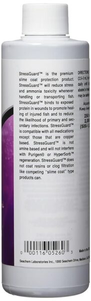 StressGuard™ is the premium slime coat protection product. StressGuard™ will reduce stress and ammonia toxicity whenever handling or transporting fish. StressGuard™ binds to exposed protein in wounds to promote healing of injured fish and to reduce the likelihood of primary and secondary infections. StressGuard™ is compatible with all medications except those that are copper based. StressGuard™ is not amine based and will not interfere with Purigen®; or HyperSorb™ regeneration. StressGuard™ does not coat resins or clog filtration like competing “slime coat” type products can.What makes StressGuard™ very successful at healing is the fact that it contains protein active colloids. This protein active colloidal agent actively seeks out any wounds, abrasions, or places where exposed proteins are and attaches to this area to help directly deliver the disinfectant in the product and start the healing process. This protein active colloid, because it binds to the exposed proteins, also acts like a liquid bandage to the abrasion. Some products are marketed to be squirted in the bag when a fish is purchased. Those products are generally acidic, with some brands being a very strong acid. Putting such a product in a small, enclosed container with a fish often does more harm than any intended good. StressGuard™ has a pH of 7.0. It will not affect the pH of an aquarium, even at large doses. There are no other products on the market that can compare to the effectiveness of StressGuard™.