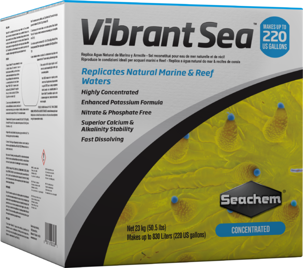 Vibrant Sea™ is a highly concentrated blend of salts formulated for marine and reef aquariums that contains all essential major, minor, and trace components found in natural seawaters, plus the added advantage of enhanced potassium levels. Its formulation is ideal for the reef environment and will provide accurate seawater concentrations of magnesium, calcium, and strontium with proper alkalinity and pH for closed reef aquarium systems.