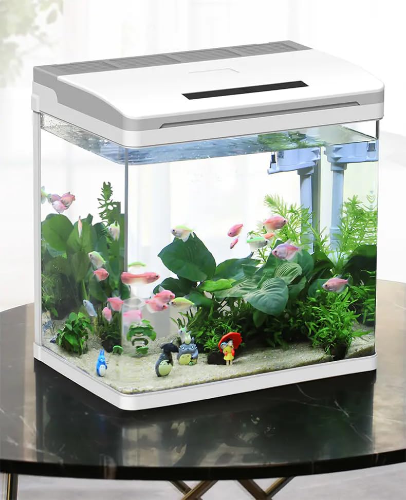 Product features: 1. High definition glass, good light transmittance; 2. Hot bending treatment technology enables seamless connection of fish tanks; 3. Multiple scenarios are applicable; 4. Energy-saving led lamp, adjustable.