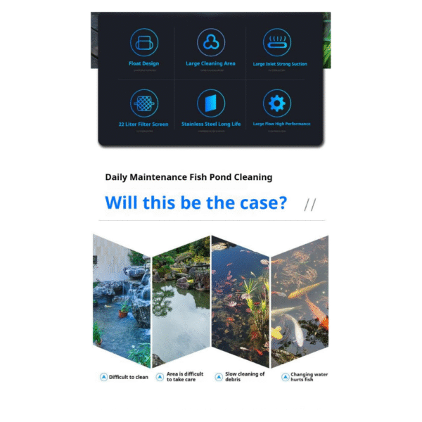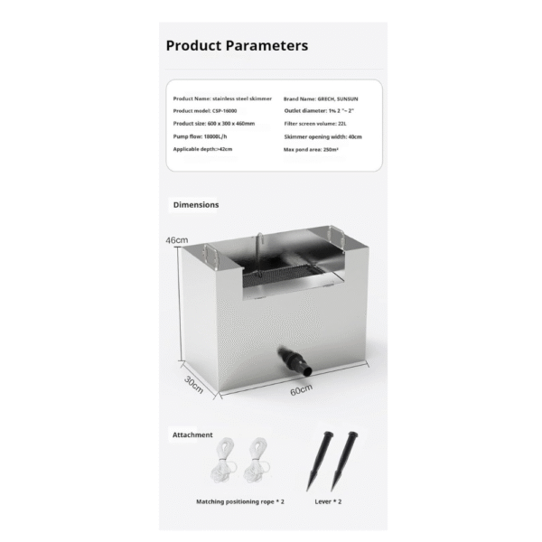 Kind of high pressure water pump with special large inlet and powerful suction capacity for first-skimming results. Extremely long service life thanks to high-quality workmanship and stainless steel elements. Powerful suction cleaning of pound surfaces uo to 250m². Large 22 litre pollution collection basket. Can be used in the pond or reservoir where full of water, the level of the water can not lower than 42cm. Model Voltage Power Output Hose adapter Filter volume Difference in depth of water Skimmer opening width Weight Dimensions L×W×H CSP-16000 220-240V/50Hz 150W 18000L/h 1½”/2″ 22L ≥42cm 400mm 18kg 600×300×460mm