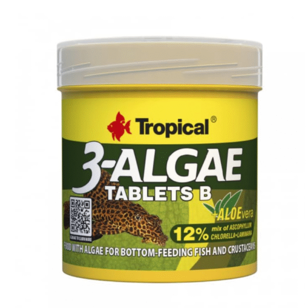3-Algae Tablets B is a food in the form of sinking tablets, rich in algae. The Premium line includes ready-made foods with many attractive additives that provide fish with excellent condition, beautiful colors, and greater resistance to disease, among other things. The Premium line includes both universal and specialized products designed for fish with specific nutritional requirements. Designed for daily feeding of freshwater and marine herbivorous fish, for which algae are an essential component of their diet, and for omnivorous fish as a supplementary food. 3-Algae Tablets B contains three algae: chlorella ( Chlorella vulgaris ), Ascophyllum nodosum , and Laminaria digitata , also known as kelp algae. Chlorella’s unsaturated fatty acids, protein (rich in essential amino acids), and vitamins, along with trace and macronutrients from kelp algae (including iodine, chromium, selenium, and iron), ensure excellent condition, rapid growth, and vitality in fish. Fish regularly fed 3-Algae Tablets B receive a high dose of chlorophyll—a green pigment concentrated in chlorella. Chlorophyll limits the growth of undesirable bacteria in the digestive tract, preventing inflammation, and, together with zeolite, aids in the excretion of toxins from fish. Aloe extract supports the fish’s immune system and promotes the development of healthy bacterial flora in the digestive tract. Due to its strengthening properties, this food is recommended for fish during quarantine, acclimatization, and convalescence. This food is also available in other forms: 3-Algae Flakes , 3-Algae Granulat , 3-Algae Tablets A – ideal as food for freshwater and marine herbivorous fish – three different species of algae – supports the immune system – recommended during quarantine, acclimatization and convalescence