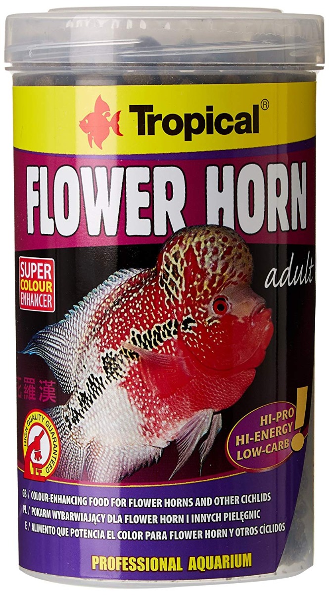 FLOWER HORN ADULT PELLET a color enhancing food for flower horn and other cichlids. High protein, floating food in the form of pellets for FLOWER HORN cichlids and other species from the Cichlidae family. It is intended for everyday feeding of adults. A high level of easily digestible protein affects fish growth and reproduction, while omega-3 and omega-6 fatty acids shape the characteristic of FLOWER HORN and many large cichlids from South America and the Central Fatty Tumor. The plant ingredients and spirulina present in the diet are the source of natural dyes. The food has also been enriched with natural astaxanthin (100 mg / kg), which makes the colors of fish regularly fed with FLOWER HORN ADULT pellets become intense and full of light. The reduced starch content protects the carnivorous fish from greasiness of internal organs. High hydrostability means that the food stays in water for a very long time, without messing it up and releasing valuable nutrients into the water. Its volume under the influence of water increases slightly, so there is no danger of digestive problems in fish that will eat a larger portion of pellets.