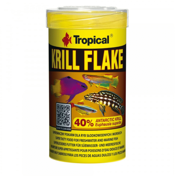 Super-tasty food for omnivorous and carnivorous aquarium fish with color-enhancing properties , in the form of flakes with an exceptionally high content of Antarctic krill (40%) . Examples of fish: Sailfin Angelfish (Pterophyllum scalare), Discus Fish (Symphysodon aequifasciatus), Cockatoo Cichlid (Apistogramma cacatuoides), Slender Barb (Puntius titteya), Sumatran Barb (Puntigrus tetrazona), Odessa Barb (Pethia padamya), Heller’s Swordtail (Xiphophorus helleri), Spotted Gourami (Xiphophorus maculatus), Dwarf Gourami (Trichogaster lalius), Mosaic Gourami (Trichogaster leerii), Peacock Guppy (Poecilia reticulata), Werner’s Rainbowfish (Iriatherina werneri), Neon Tetra (Paracheirodon innesi), Ramirez’s Cichlid (Mikrogeophagus ramirezi), Agassiz’s Cichlid (Apistogramma agassizii), Panda Corydoras (Corydoras panda), Congo krill (Phenacogrammus interruptus), Benefits for your fish intensifies coloration stimulates feeding has a positive effect on condition supports growth and maturation Size and form of food flake Product description super-tasty, multi-ingredient color-enhancing food in the form of flakes with a high content of Antarctic krill (40%). intended for everyday feeding of omnivorous and carnivorous fish in marine and freshwater aquariums due to its high palatability, it is particularly suitable for feeding fish that are unfamiliar with prepared foods (wild-caught fish) and fish with high nutritional requirements the Antarctic krill used in the food is a source of: valuable protein rich in exogenous amino acids, chitin supporting the digestive tract, unsaturated fatty acids, including omega-3, which support fish’s immunity, and carotenoids enhancing fish’s coloration regular use of the food ensures intense colors and excellent condition of fish and stimulates them to breed the optimal level of phosphorus meets the needs of fish and limits algae bloom Tropical advises: Regularly using a color-enhancing food for your fish will quickly enhance their color. The effect can be visible after just two weeks of using a color-enhancing food. However, remember that the color development of fish depends on many factors.