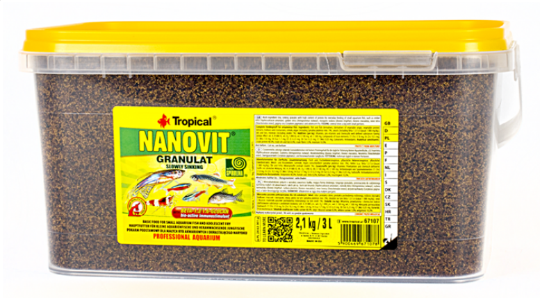 NANOVIT GRANULAT basic food for small aquarium fish and adolescent fry. Multi-ingredient food in the form of a small sinking granulate for small aquarium fish, such as: Amanda (Hyphessobrycon amandae), golden agitator (Hemigrammus rodwayi), Bornean borbora (Boraras brigittae), Borabella maculatus, Innes neon (Paracheirodon innesi) ), pygmy oyster (Corydoras pygmaeus), as well as adolescent fry. Fish immunity strengthens the natural immunostimulant – beta-glucan and stabilized vitamin C. Several dozen selected ingredients of the highest quality, supplemented with an optimally selected set of vitamins and micronutrients, secures the nutritional and energy needs of the most demanding fish species, including the fry.