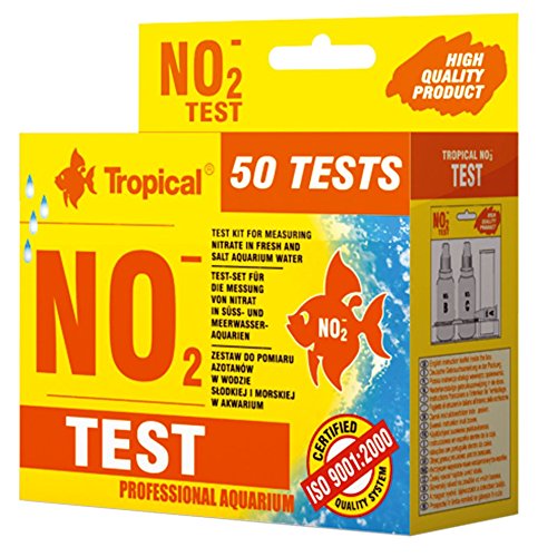 TEST NO2 test kit for measuring the concentration of nitrite (NO2-) in fresh and salt water. Test intended for measuring the concentration of nitrite (NO2-) within the range of 0.0-3.3 mg/l in fresh and salt water. It is convenient and extremely easy to use. The relevant reagent solution is added to the water drop by drop until the colour of the sample changes, then it should be compared with the colour scale provided. The sources of nitrites are fish excreta, uneaten food and other organic wastes which accumulate in the aquarium and are broken down by the bacteria. The concentration of nitrites in the aquarium should be zero, as they are very dangerous for the fish. The highest concentration of nitrites is usually observed in new, overpopulated tanks or after treatment with bactericidal agents. For further water inspection we recommend other Tropical tests.