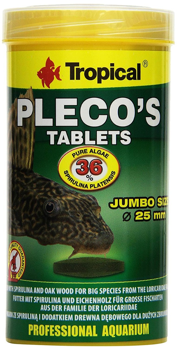 - everyday feeding of large species of fish from the family Loricariidae, such as Hypostomus plecostomus, Glyptoperichthys gibbiceps or a larger group of smaller algae-eating bryozoids. PLECO’S TABLETS tablets contain 36% spirulina, which provides easily digestible protein, natural dyes and substances that activate the immune system of the fish.